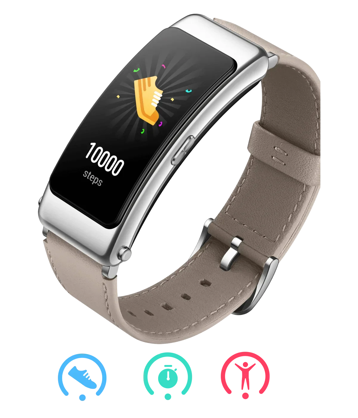I TalkBand B7 comes in 3 strap options with well-thought colours for different needs. The fluoroelastomer straps offer greater comfort and motivation for workouts, while the sophisticated leather design complements your elegant style. You can also choose Titanium Grey for its dignified metallic shine.